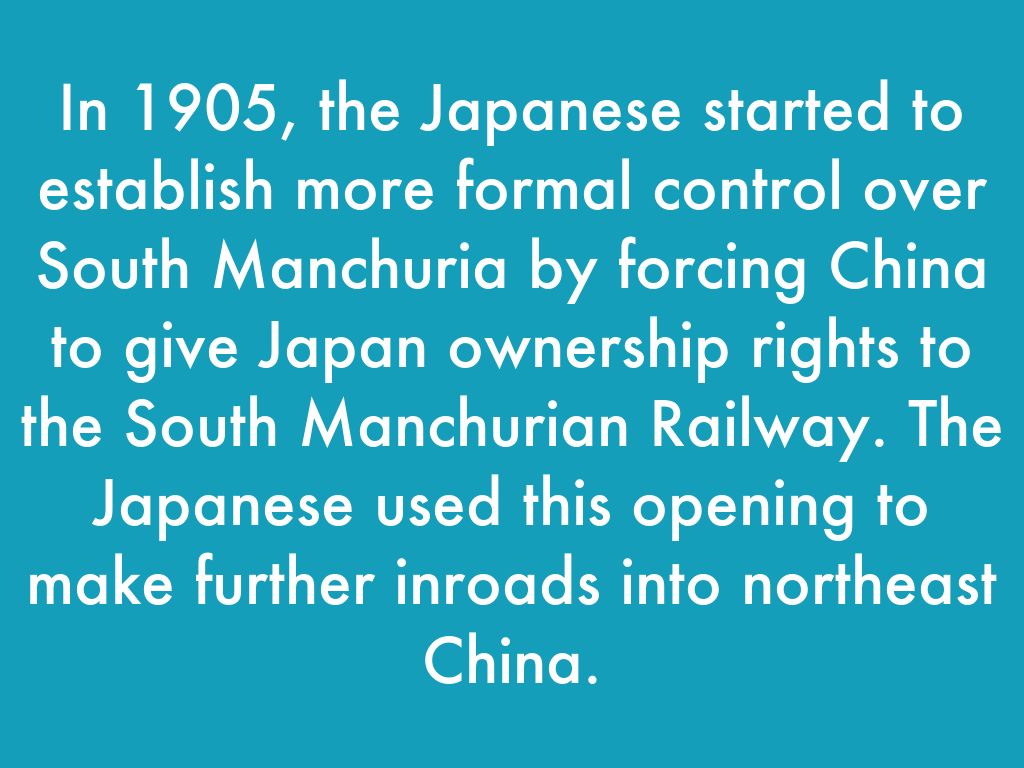In 1905, the Japanese started to establish more formal control over South Manchuria by forcing China to give Japan ownership rights to the South Manchurian Railway. The Japanese used this opening to make further inroads into northeast China.