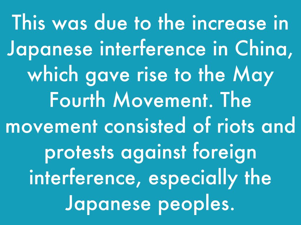 This was due to the increase in Japanese interference in China, which gave rise to the May Fourth Movement. The movement consisted of riots and protests against foreign interference, especially the Japanese peoples.
