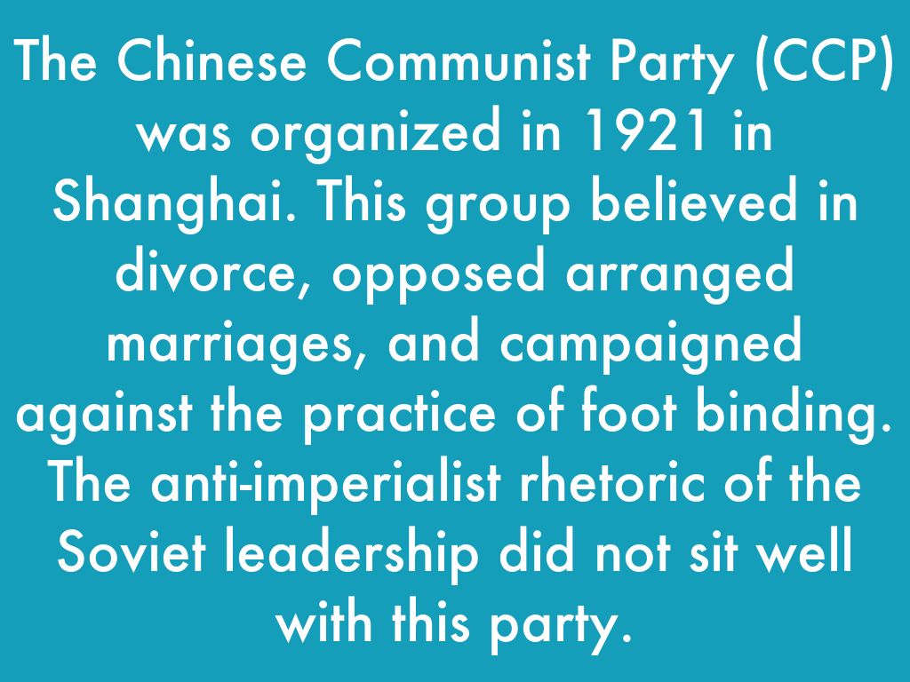The Chinese Communist Party (CCP) was organized in 1921 in Shanghai. This group believed in divorce, opposed arranged marriages, and campaigned against the practice of foot binding. The anti-imperialist rhetoric of the Soviet leadership did not sit well with this party.