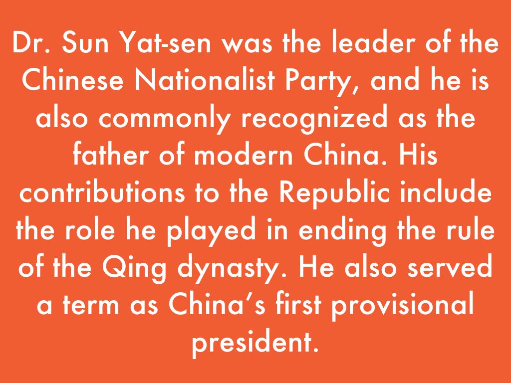 Dr. Sun Yat-sen was the leader of the Chinese Nationalist Party, and he is also commonly recognized as the father of modern China. His contributions to the Republic include the role he played in ending the rule of the Qing dynasty. He also served a term as China’s first provisional president.
