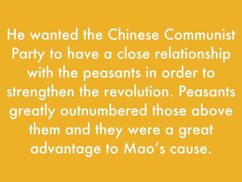 He wanted the Chinese Communist Party to have a close relationship with the peasants in order to strengthen the revolution. Peasants greatly outnumbered those above them and they were a great advantage to Mao’s cause.