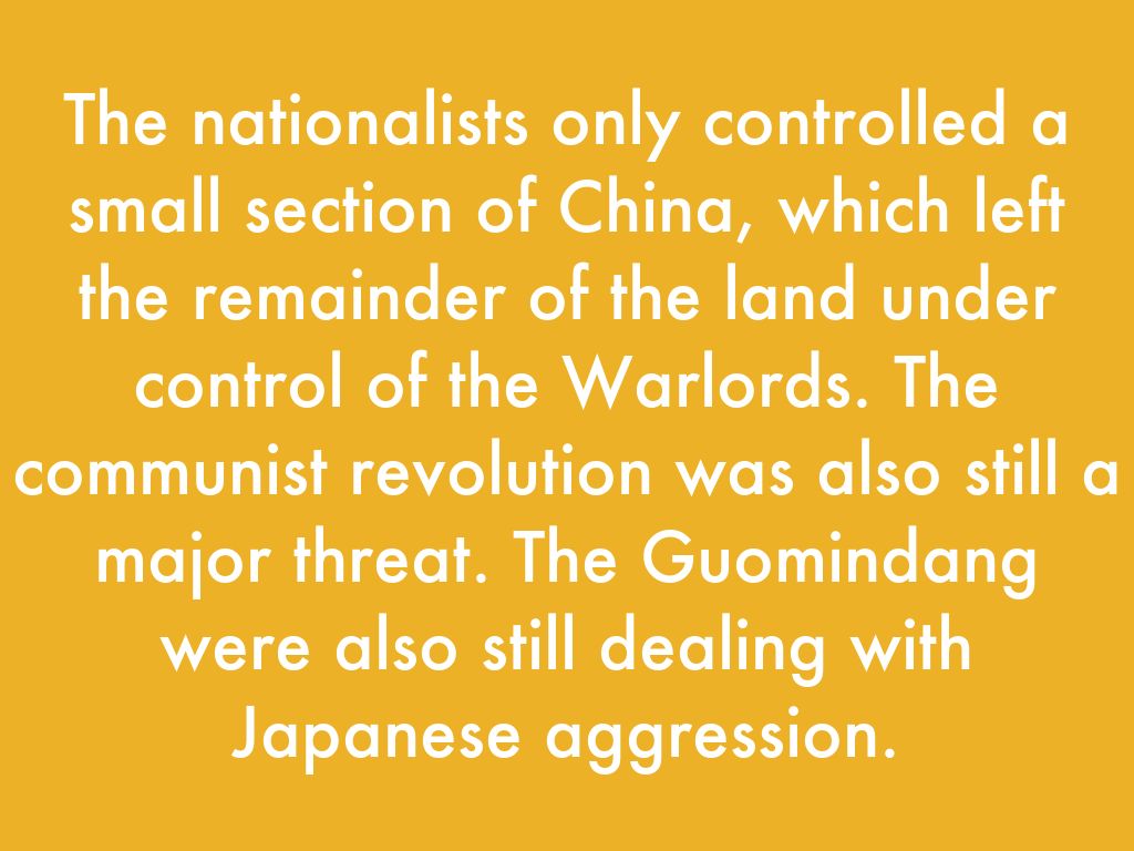 The nationalists only controlled a small section of China, which left the remainder of the land under control of the Warlords. The communist revolution was also still a major threat. The Guomindang were also still dealing with Japanese aggression.