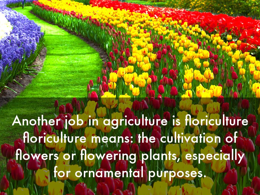 Another job in agriculture is floriculture floriculture means: the cultivation of flowers or flowering plants, especially for ornamental purposes.