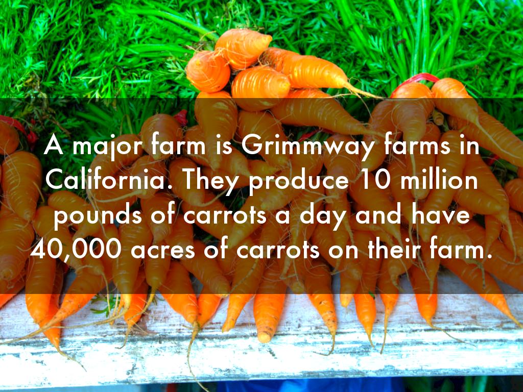 A major farm is Grimmway farms in California. They produce 10 million pounds of carrots a day and have 40,000 acres of carrots on their farm.