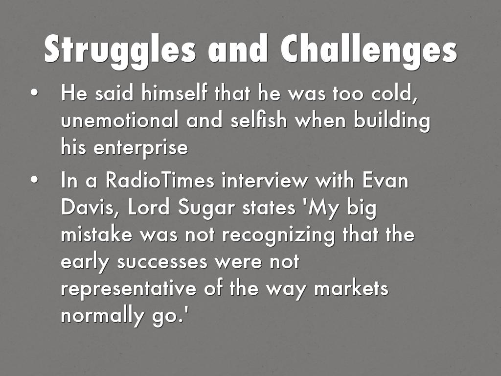 In a RadioTimes interview with Evan Davis, Lord Sugar states 'My big mistake was not recognizing that the early successes were not representative of the way markets normally go.'