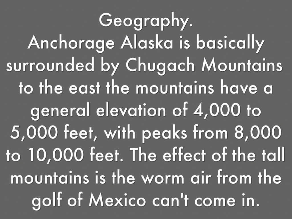 Anchorage Alaska is basically surrounded by Chugach Mountains to the east the mountains have a general elevation of 4,000 to 5,000 feet, with peaks from 8,000 to 10,000 feet. The effect of the tall mountains is the worm air from the golf of Mexico can't come in.