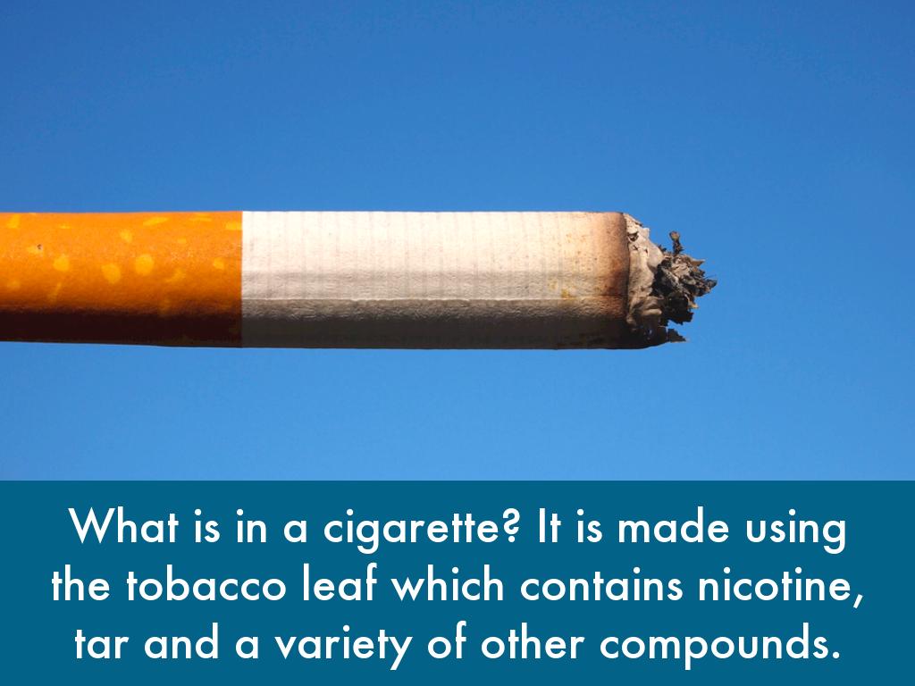 What is in a cigarette? It is made using the tobacco leaf which contains nicotine, tar and a variety of other compounds.
