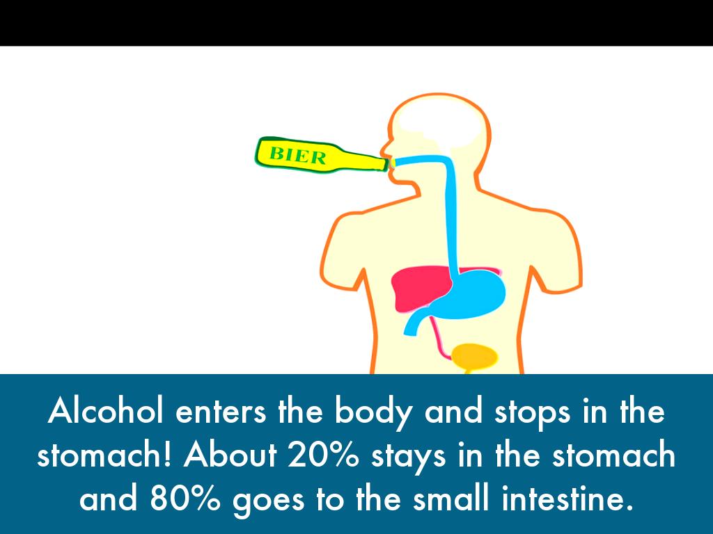 Alcohol enters the body and stops in the stomach! About 20% stays in the stomach and 80% goes to the small intestine.