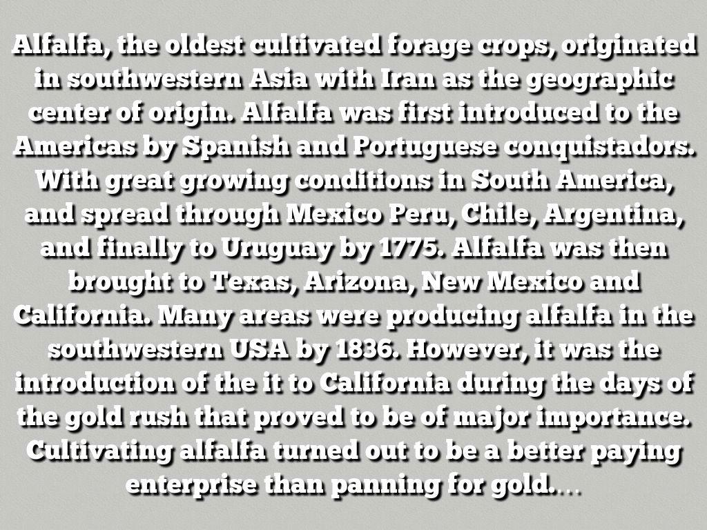 Alfalfa, the oldest cultivated forage crops, originated in southwestern Asia with Iran as the geographic center of origin. Alfalfa was first introduced to the Americas by Spanish and Portuguese conquistadors. With great growing conditions in South America, and spread through Mexico Peru, Chile, Argentina, and finally to Uruguay by 1775. Alfalfa was then brought to Texas, Arizona, New Mexico and California. Many areas were producing alfalfa in the southwestern USA by 1836. However, it was the introduction of the it to California during the days of the gold rush that proved to be of major importance. Cultivating alfalfa turned out to be a better paying enterprise than panning for gold.…