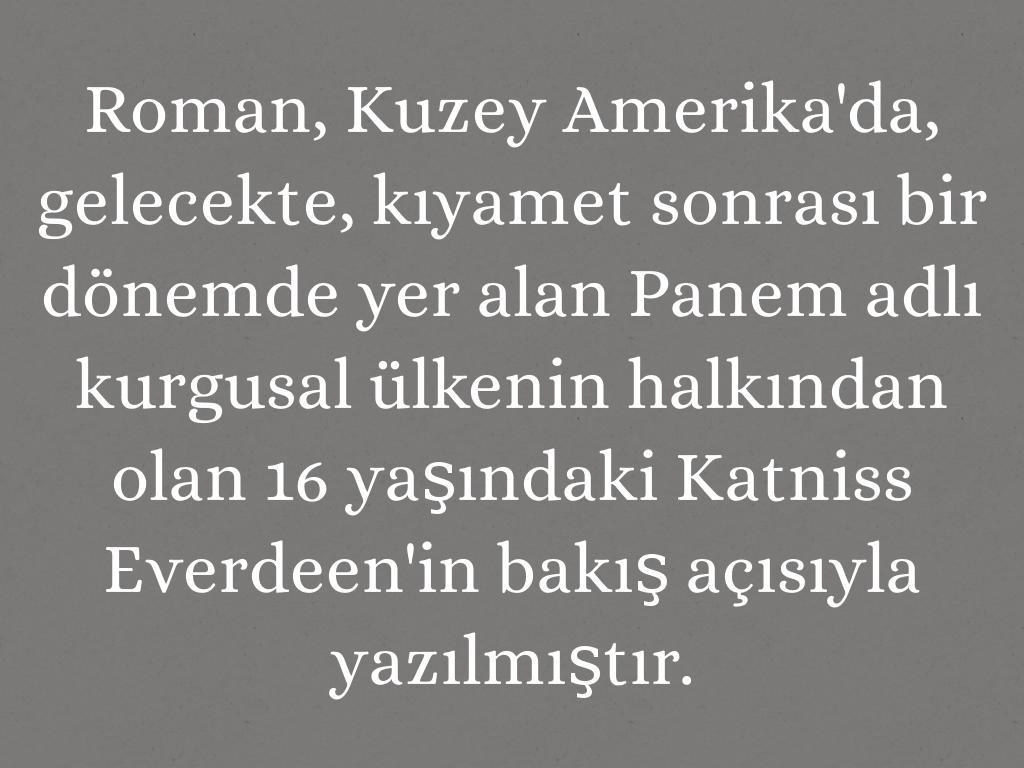 Roman, Kuzey Amerika'da, gelecekte, kıyamet sonrası bir dönemde yer alan Panem adlı kurgusal ülkenin halkından olan 16 yaşındaki Katniss Everdeen'in bakış açısıyla yazılmıştır.