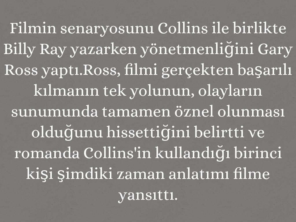 Filmin senaryosunu Collins ile birlikte Billy Ray yazarken yönetmenliğini Gary Ross yaptı.Ross, filmi gerçekten başarılı kılmanın tek yolunun, olayların sunumunda tamamen öznel olunması olduğunu hissettiğini belirtti ve romanda Collins'in kullandığı birinci kişi şimdiki zaman anlatımı filme yansıttı.