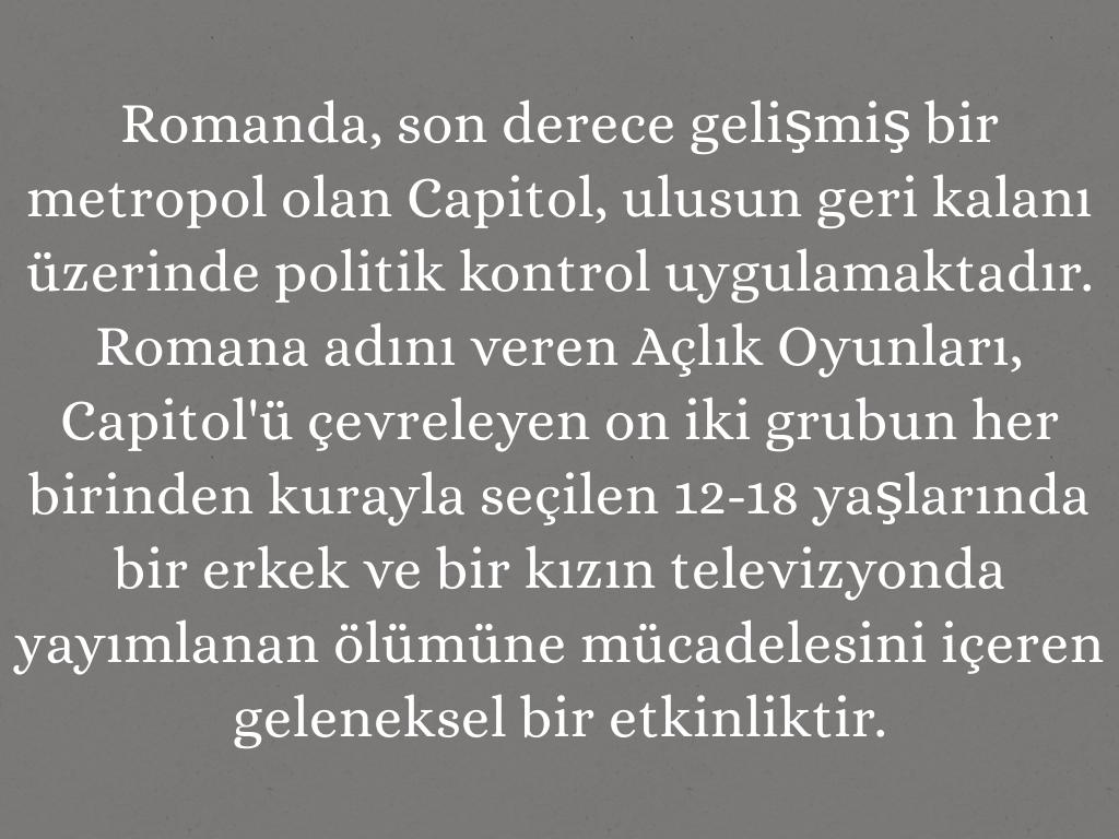 Romanda, son derece gelişmiş bir metropol olan Capitol, ulusun geri kalanı üzerinde politik kontrol uygulamaktadır. Romana adını veren Açlık Oyunları, Capitol'ü çevreleyen on iki grubun her birinden kurayla seçilen 12-18 yaşlarında bir erkek ve bir kızın televizyonda yayımlanan ölümüne mücadelesini içeren geleneksel bir etkinliktir.