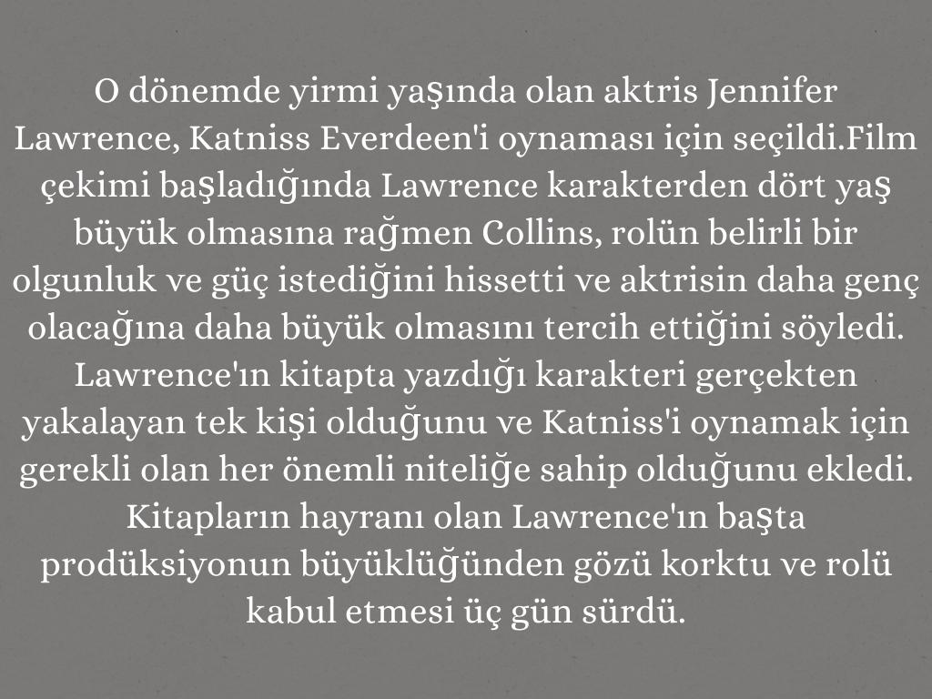 O dönemde yirmi yaşında olan aktris Jennifer Lawrence, Katniss Everdeen'i oynaması için seçildi.Film çekimi başladığında Lawrence karakterden dört yaş büyük olmasına rağmen Collins, rolün belirli bir olgunluk ve güç istediğini hissetti ve aktrisin daha genç olacağına daha büyük olmasını tercih ettiğini söyledi. Lawrence'ın kitapta yazdığı karakteri gerçekten yakalayan tek kişi olduğunu ve Katniss'i oynamak için gerekli olan her önemli niteliğe sahip olduğunu ekledi. Kitapların hayranı olan Lawrence'ın başta prodüksiyonun büyüklüğünden gözü korktu ve rolü kabul etmesi üç gün sürdü.