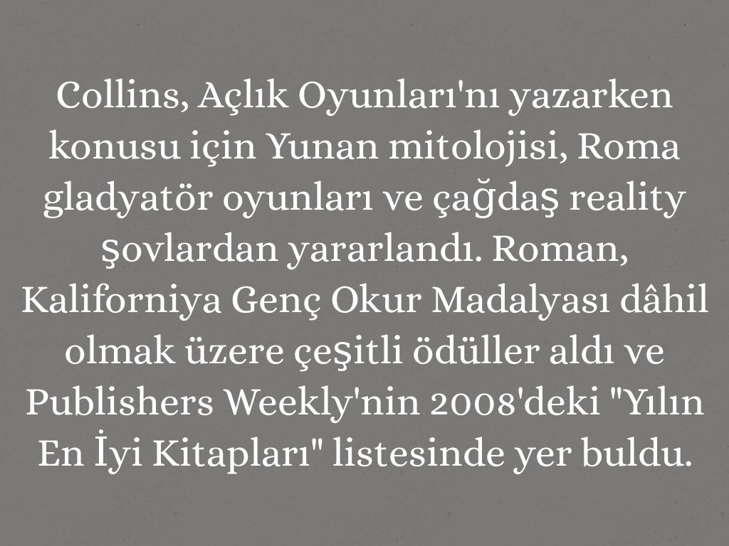 Collins, Açlık Oyunları'nı yazarken konusu için Yunan mitolojisi, Roma gladyatör oyunları ve çağdaş reality şovlardan yararlandı. Roman, Kaliforniya Genç Okur Madalyası dâhil olmak üzere çeşitli ödüller aldı ve Publishers Weekly'nin 2008'deki "Yılın En İyi Kitapları" listesinde yer buldu.