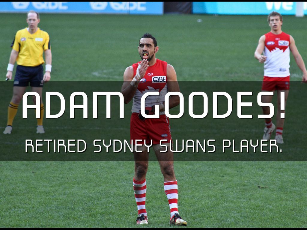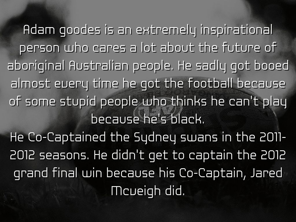 Adam goodes is an extremely inspirational person who cares a lot about the future of aboriginal Australian people. He sadly got booed almost every time he got the football because of some stupid people who thinks he can't play because he's black. He Co-Captained the Sydney swans in the 2011-2012 seasons. He didn't get to captain the 2012 grand final win because his Co-Captain, Jared Mcveigh did.