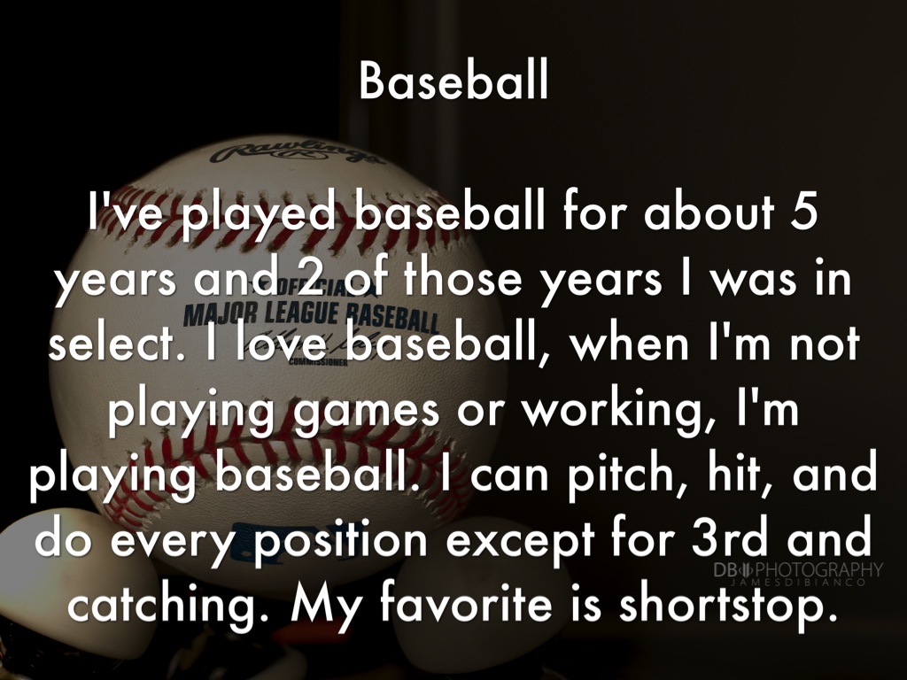 I've played baseball for about 5 years and 2 of those years I was in select. I love baseball, when I'm not playing games or working, I'm playing baseball. I can pitch, hit, and do every position except for 3rd and catching. My favorite is shortstop.