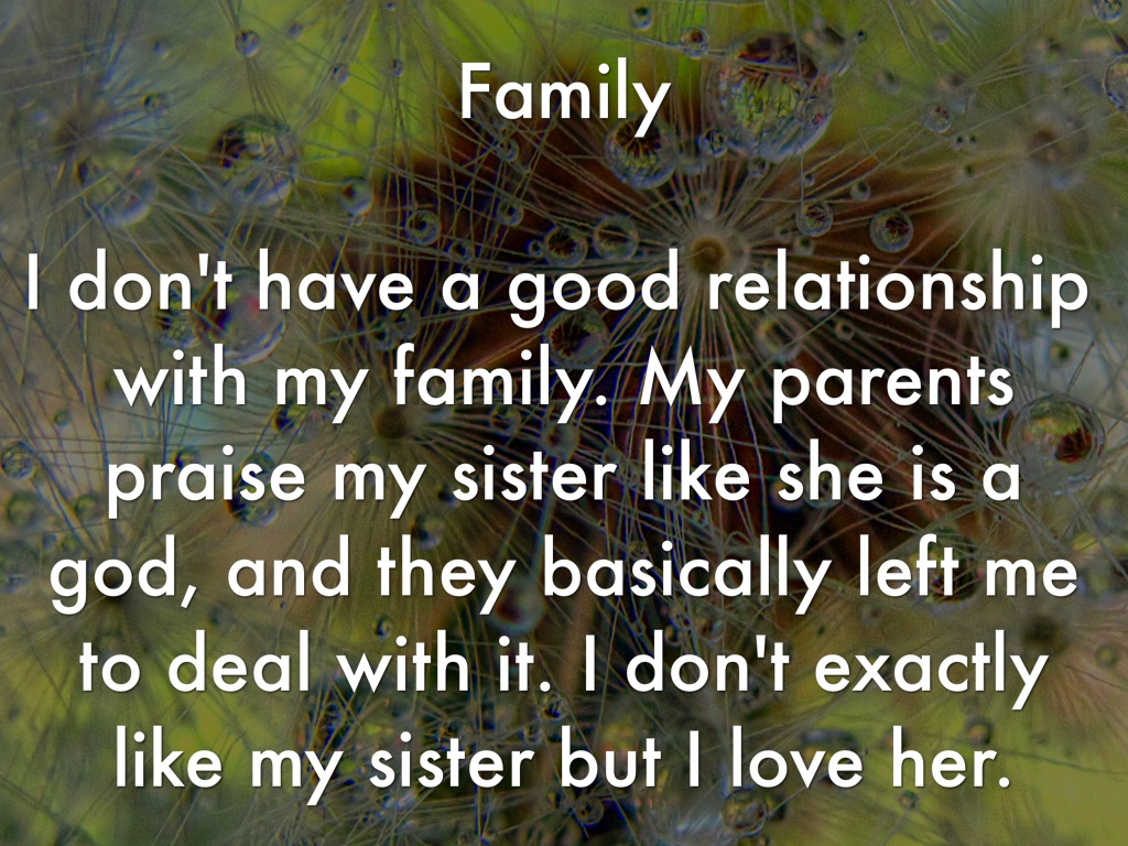 I don't have a good relationship with my family. My parents praise my sister like she is a god, and they basically left me to deal with it. I don't exactly like my sister but I love her.