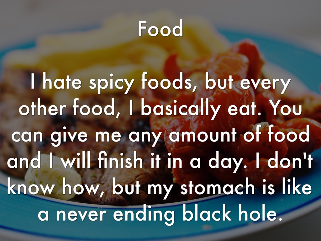 I hate spicy foods, but every other food, I basically eat. You can give me any amount of food and I will finish it in a day. I don't know how, but my stomach is like a never ending black hole.