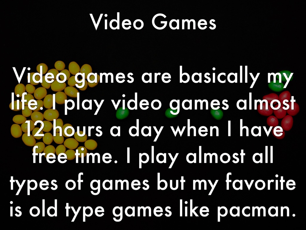 Video games are basically my life. I play video games almost 12 hours a day when I have free time. I play almost all types of games but my favorite is old type games like pacman.