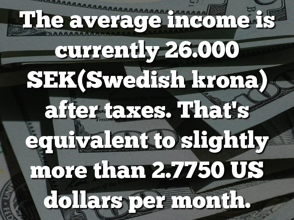 The average income is currently 26.000 SEK(Swedish krona) after taxes. That's equivalent to slightly more than 2.7750 US dollars per month.