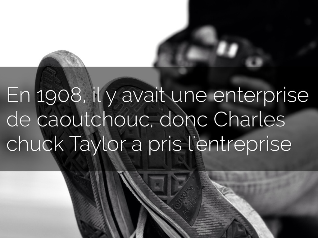 En 1908, il y avait une enterprise de caoutchouc, donc Charles chuck Taylor a pris l'entreprise