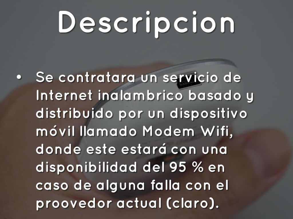 Se contratara un servicio de Internet inalambrico basado y distribuido por un dispositivo móvil llamado Modem Wifi, donde este estará con una disponibilidad del 95 % en caso de alguna falla con el proovedor actual (claro).