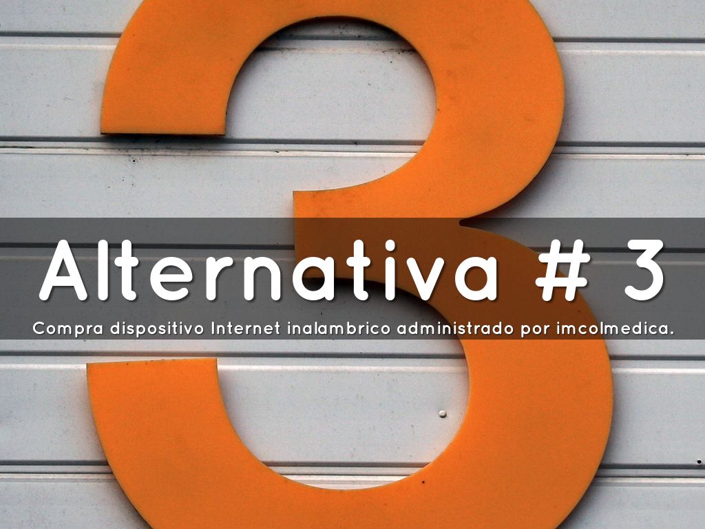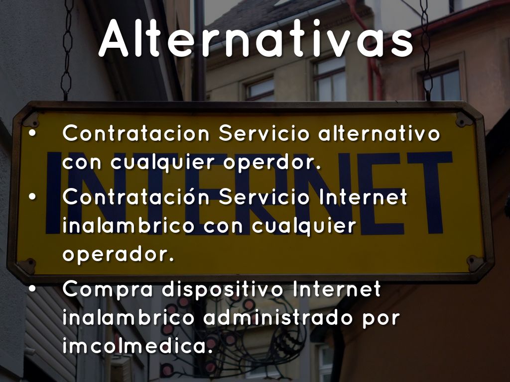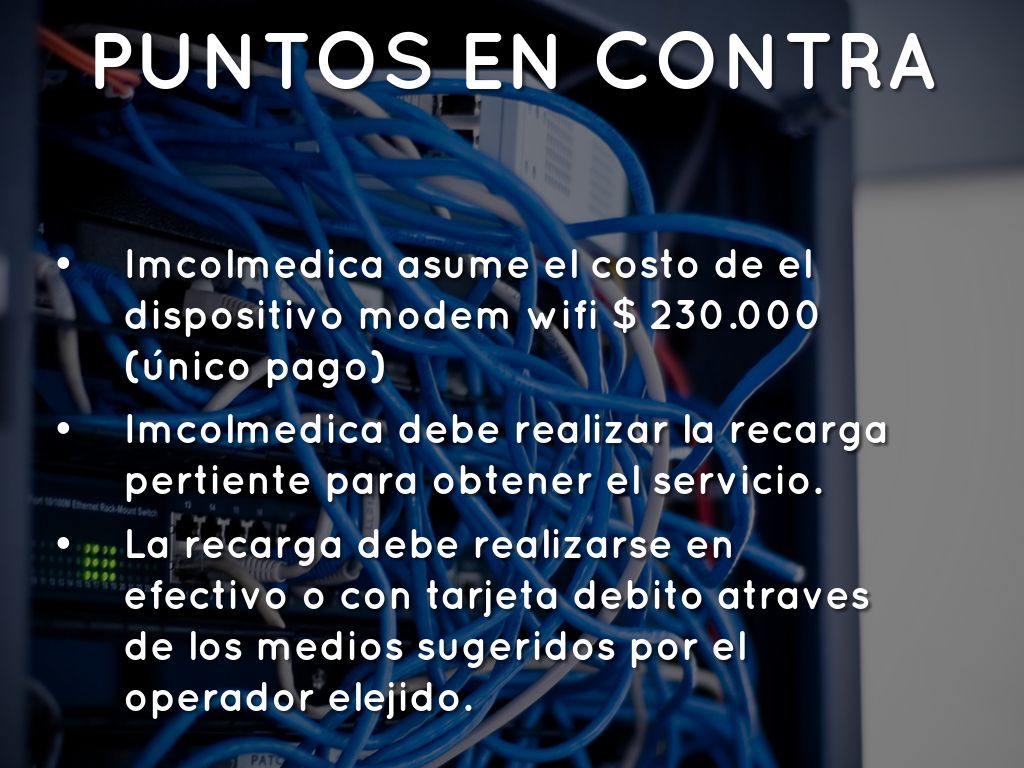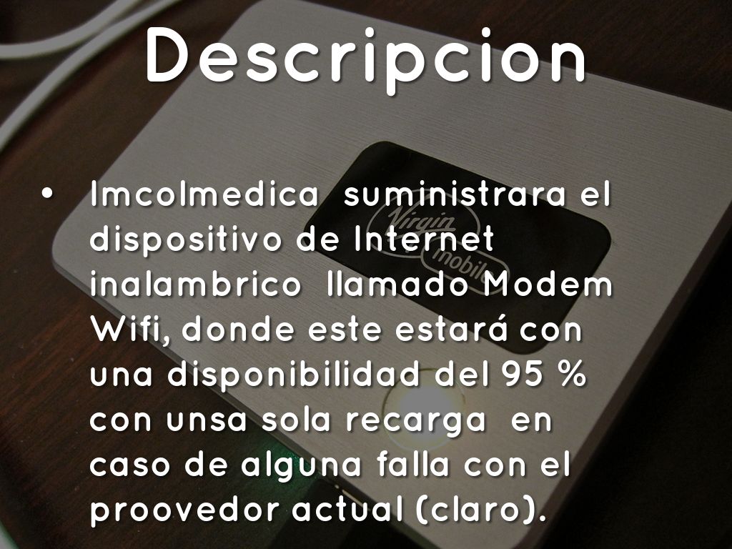 Imcolmedica suministrara el dispositivo de Internet inalambrico llamado Modem Wifi, donde este estará con una disponibilidad del 95 % con unsa sola recarga en caso de alguna falla con el proovedor actual (claro).