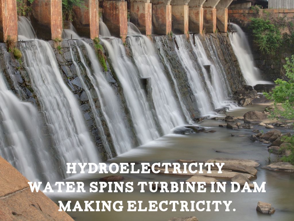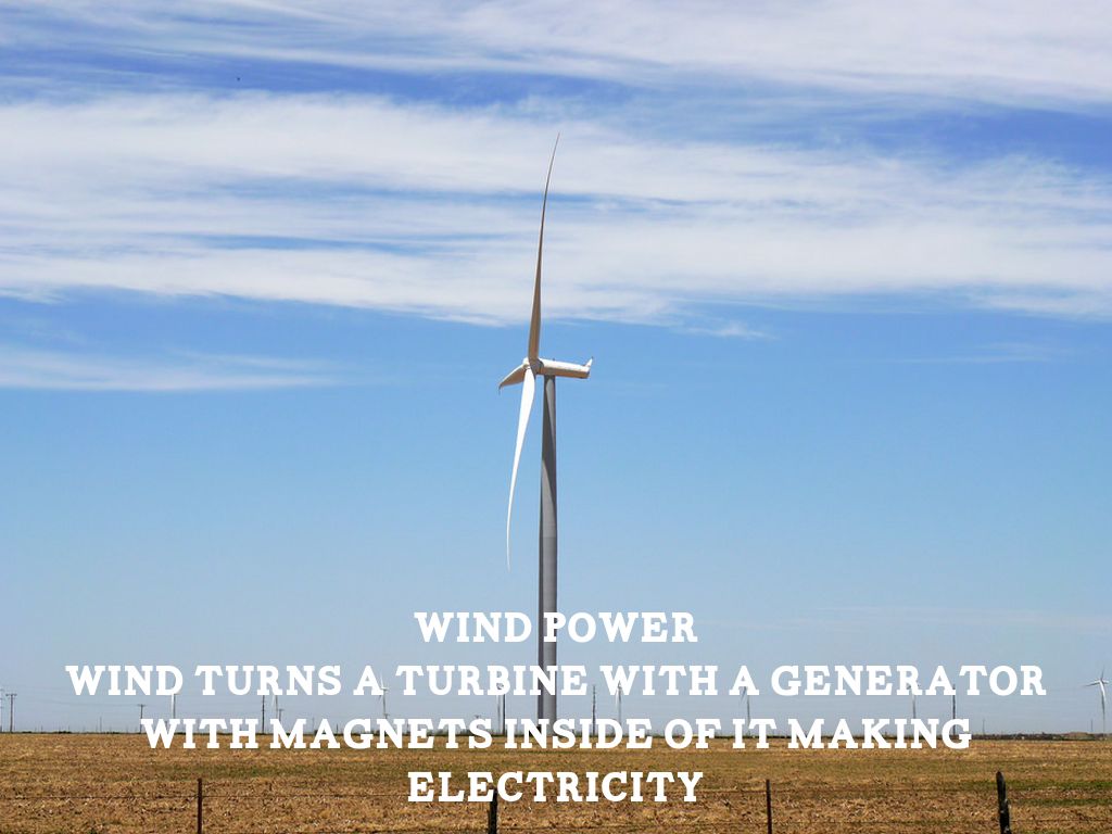 wind turns a turbine with a generator with magnets inside of it making electricity