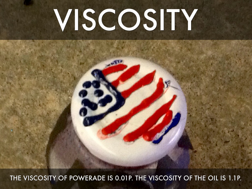 THE VISCOSITY OF POWERADE IS 0.01P. THE VISCOSITY OF THE OIL IS 1.1P.