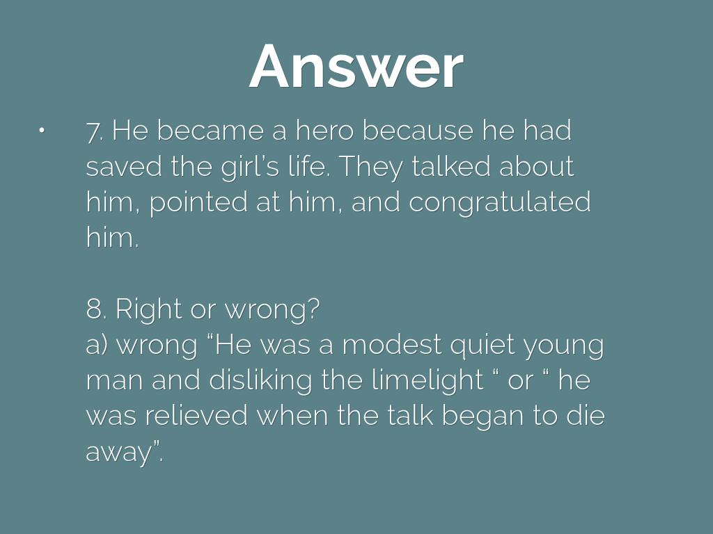 7. He became a hero because he had saved the girl’s life. They talked about him, pointed at him, and congratulated him.