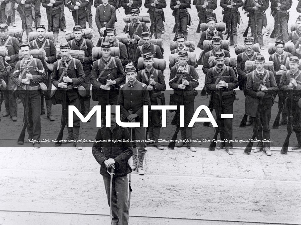 Citizen soldiers who were called out for emergencies to defend their homes in villages. Militias were first formed in New England to guard against Indian attacks.