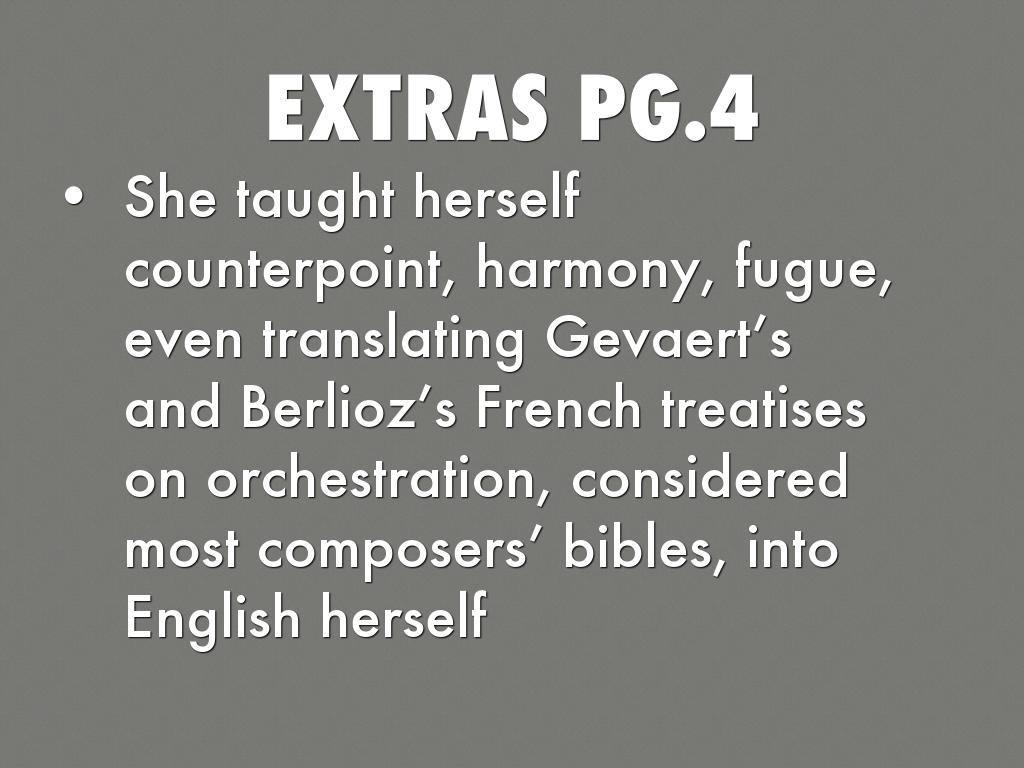 She taught herself counterpoint, harmony, fugue, even translating Gevaert’s and Berlioz’s French treatises on orchestration, considered most composers’ bibles, into English herself
