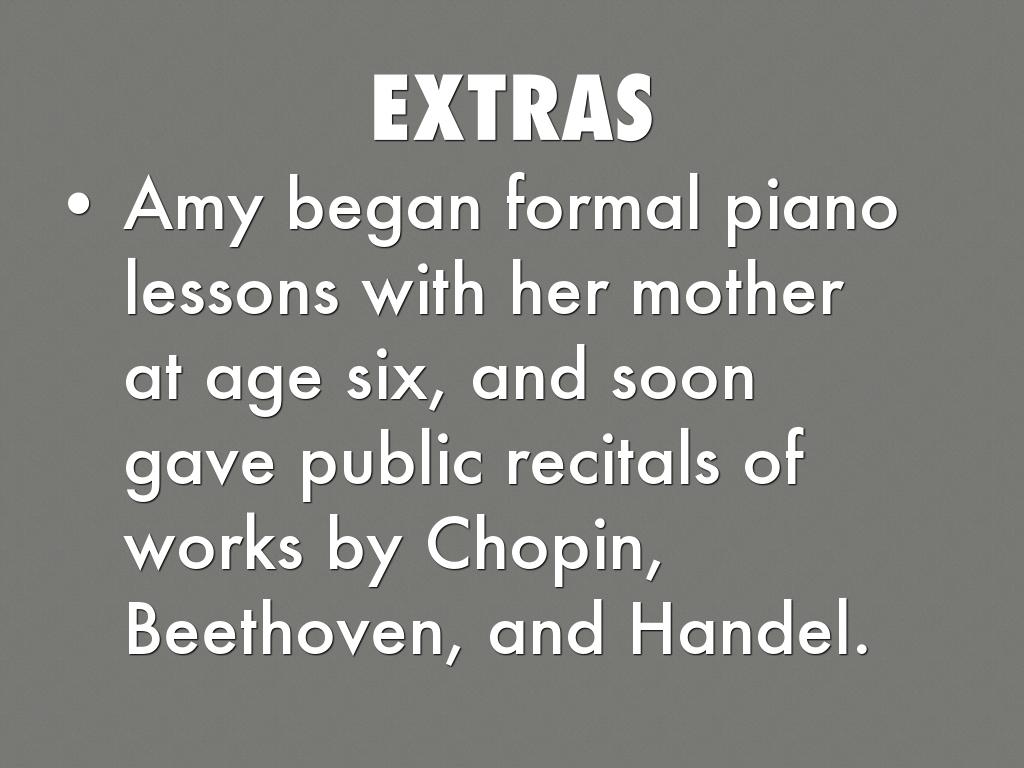Amy began formal piano lessons with her mother at age six, and soon gave public recitals of works by Chopin, Beethoven, and Handel.