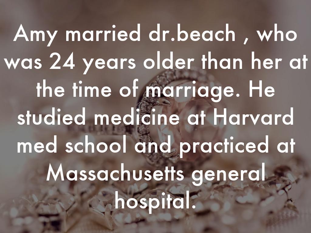 Amy married dr.beach , who was 24 years older than her at the time of marriage. He studied medicine at Harvard med school and practiced at Massachusetts general hospital.