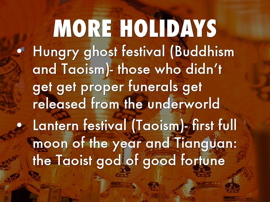 Hungry ghost festival (Buddhism and Taoism)- those who didn’t get get proper funerals get released from the underworld