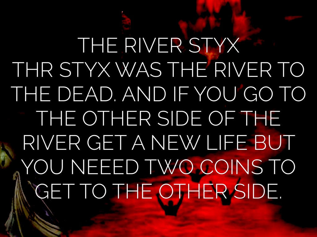 THR STYX WAS THE RIVER TO THE DEAD. AND IF YOU GO TO THE OTHER SIDE OF THE RIVER GET A NEW LIFE BUT YOU NEEED TWO COINS TO GET TO THE OTHER SIDE.