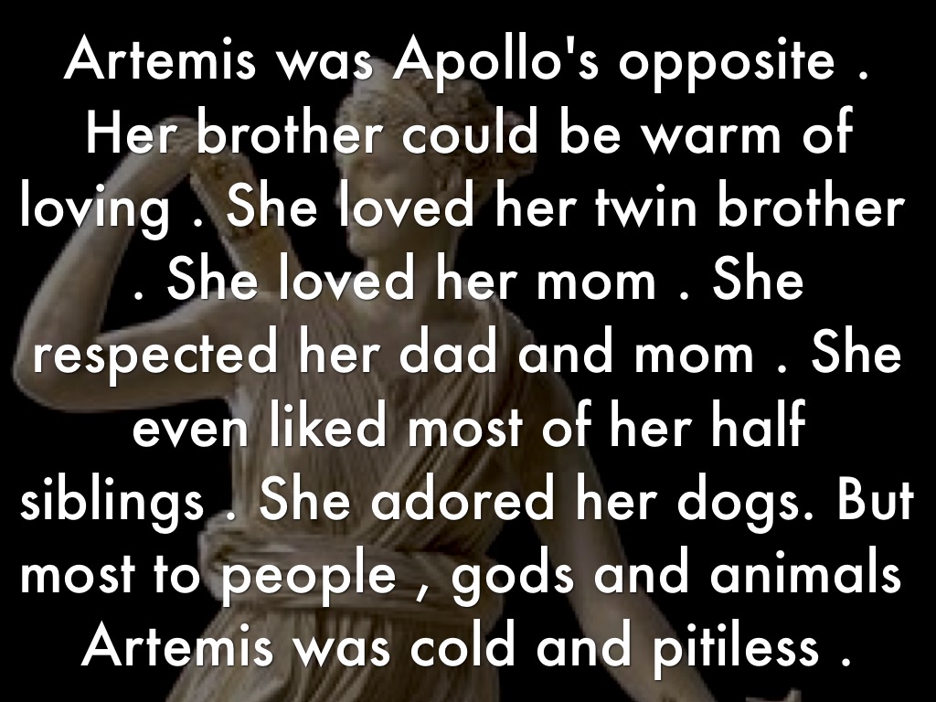 Artemis was Apollo's opposite . Her brother could be warm of loving . She loved her twin brother . She loved her mom . She respected her dad and mom . She even liked most of her half siblings . She adored her dogs. But most to people , gods and animals Artemis was cold and pitiless .
