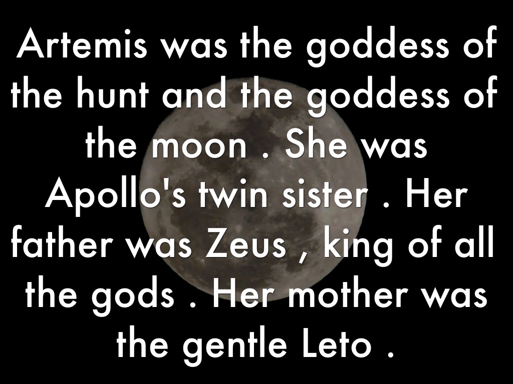 Artemis was the goddess of the hunt and the goddess of the moon . She was Apollo's twin sister . Her father was Zeus , king of all the gods . Her mother was the gentle Leto .