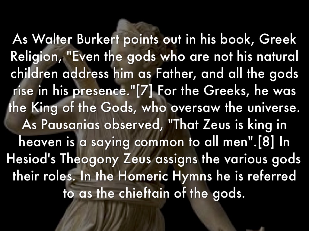 As Walter Burkert points out in his book, Greek Religion, "Even the gods who are not his natural children address him as Father, and all the gods rise in his presence."[7] For the Greeks, he was the King of the Gods, who oversaw the universe. As Pausanias observed, "That Zeus is king in heaven is a saying common to all men".[8] In Hesiod's Theogony Zeus assigns the various gods their roles. In the Homeric Hymns he is referred to as the chieftain of the gods.
