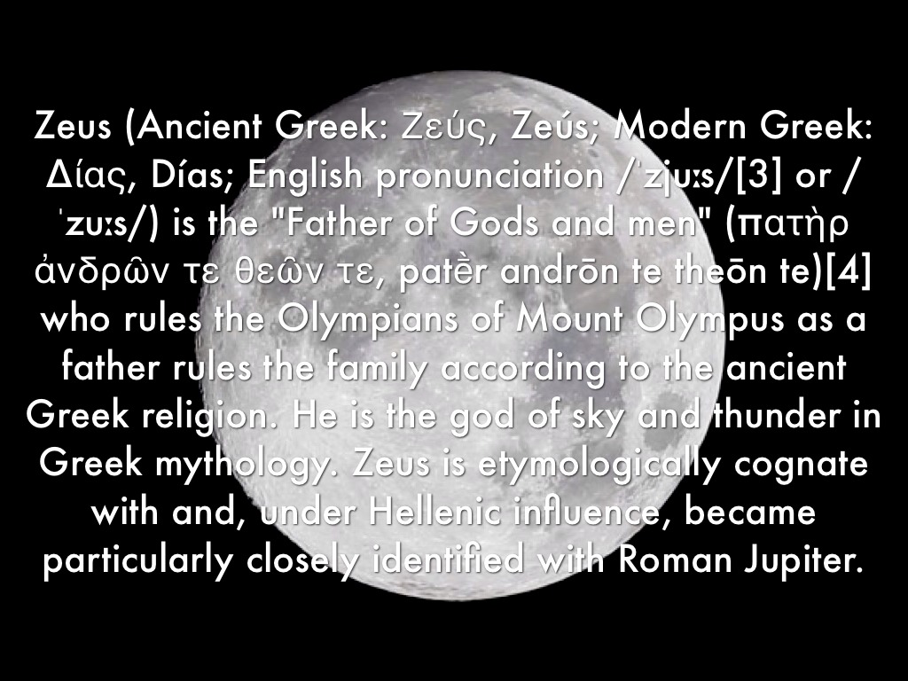 Zeus (Ancient Greek: Ζεύς, Zeús; Modern Greek: Δίας, Días; English pronunciation /ˈzjuːs/[3] or /ˈzuːs/) is the "Father of Gods and men" (πατὴρ ἀνδρῶν τε θεῶν τε, patḕr andrōn te theōn te)[4] who rules the Olympians of Mount Olympus as a father rules the family according to the ancient Greek religion. He is the god of sky and thunder in Greek mythology. Zeus is etymologically cognate with and, under Hellenic influence, became particularly closely identified with Roman Jupiter.