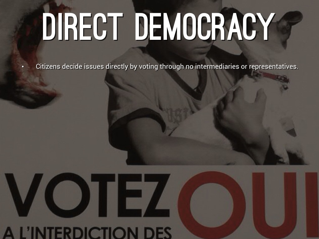Citizens decide issues directly by voting through no intermediaries or representatives.