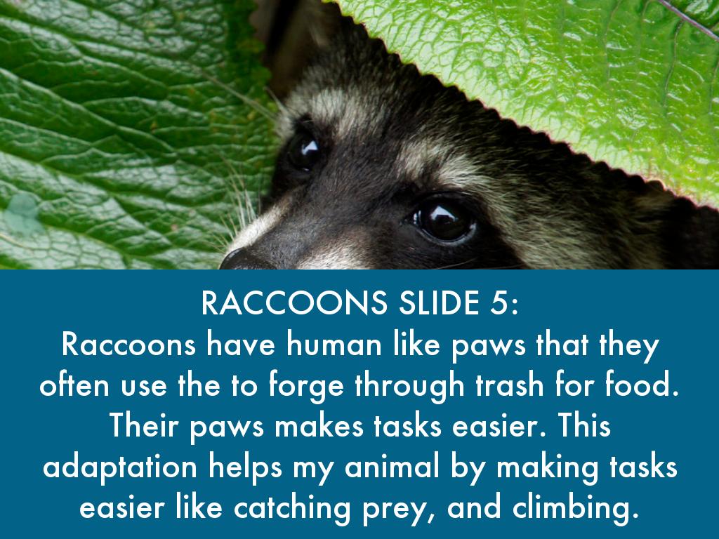 RACCOONS SLIDE 5: Raccoons have human like paws that they often use the to forge through trash for food. Their paws makes tasks easier. This adaptation helps my animal by making tasks easier like catching prey, and climbing.