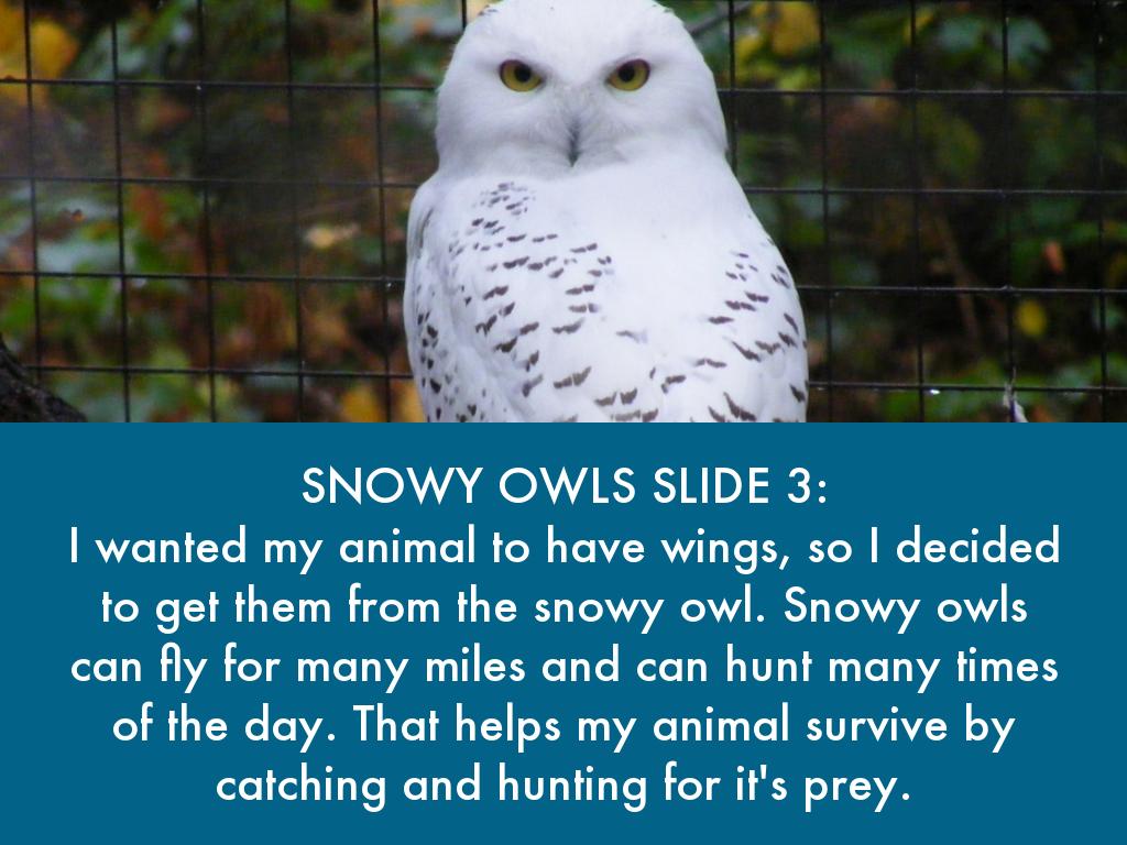 SNOWY OWLS SLIDE 3: I wanted my animal to have wings, so I decided to get them from the snowy owl. Snowy owls can fly for many miles and can hunt many times of the day. That helps my animal survive by catching and hunting for it's prey.