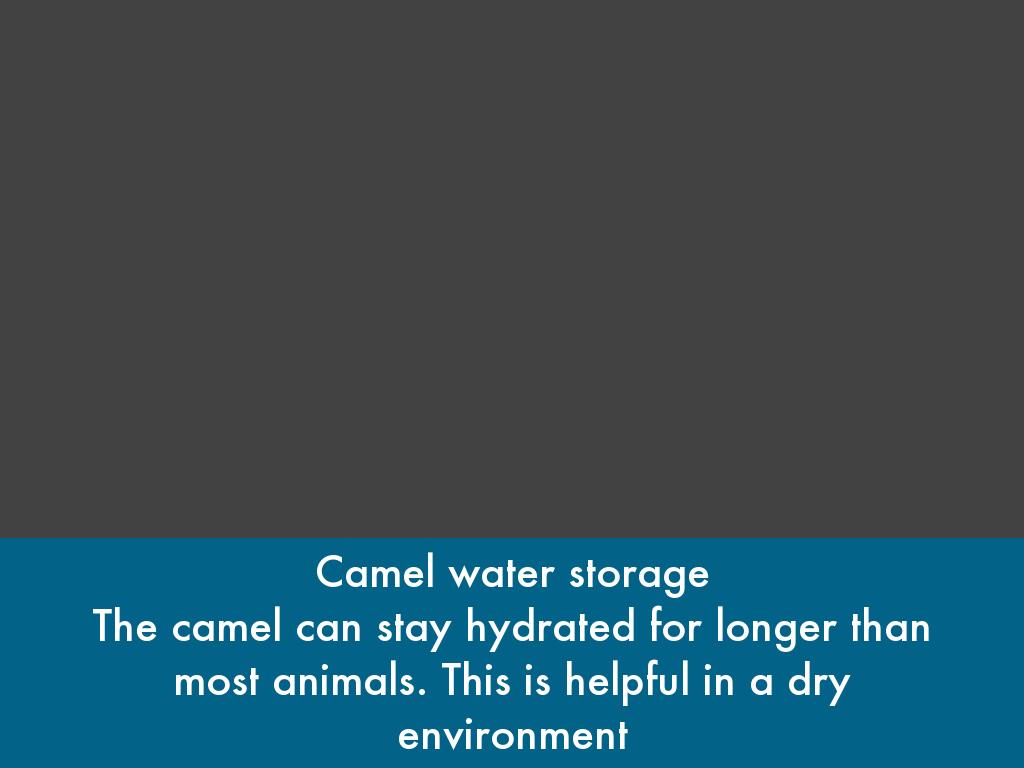 The camel can stay hydrated for longer than most animals. This is helpful in a dry environment.