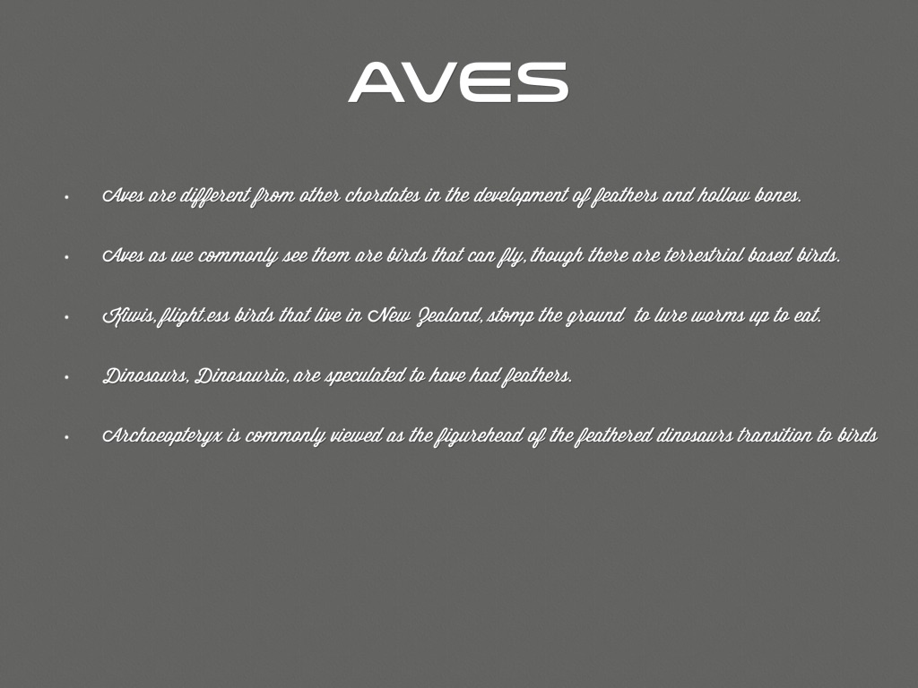 Aves are different from other chordates in the development of feathers and hollow bones.