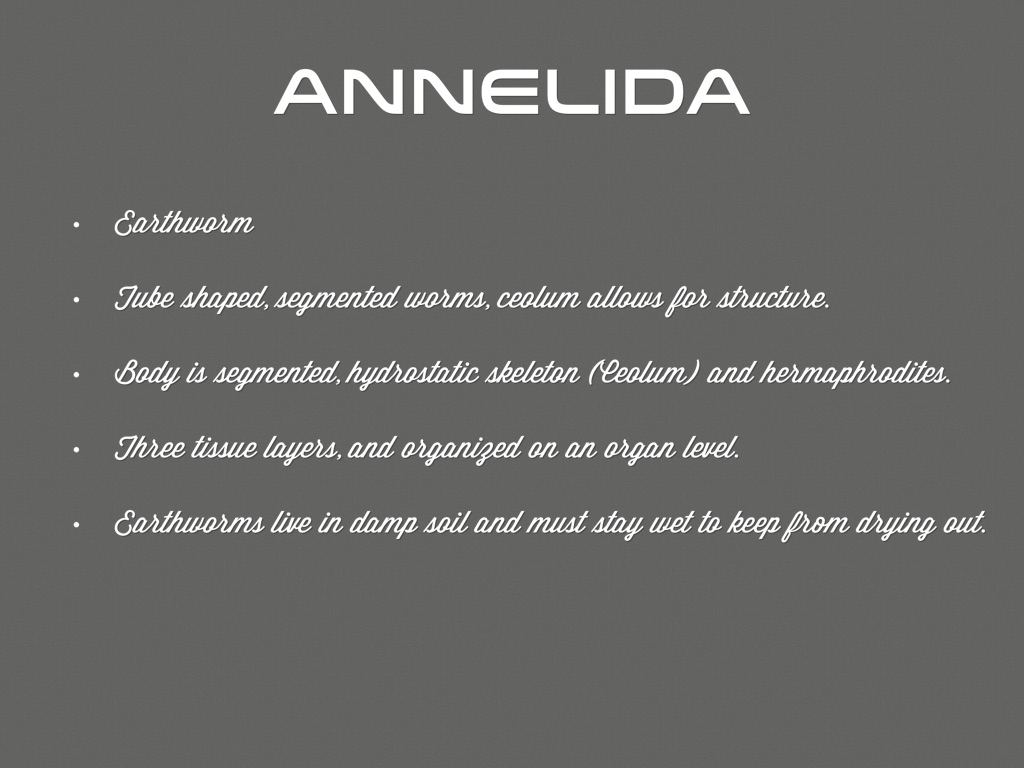 Body is segmented, hydrostatic skeleton (Ceolum) and hermaphrodites.