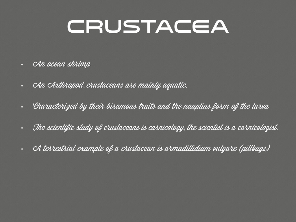 A terrestrial example of a crustacean is armadillidium vulgare (pillbugs)