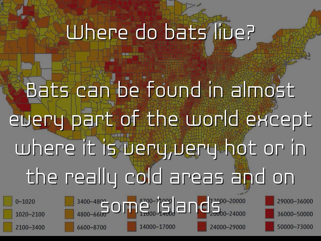 Bats can be found in almost every part of the world except where it is very,very hot or in the really cold areas and on some islands
