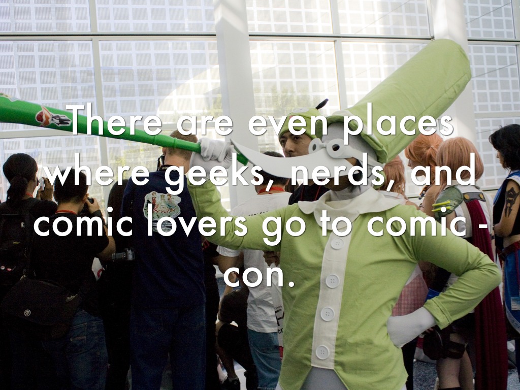 There are even places where geeks, nerds, and comic lovers go to comic - con.