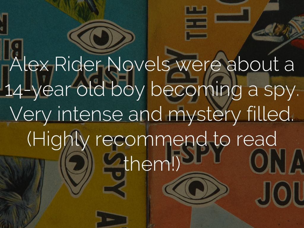 Alex Rider Novels were about a 14-year old boy becoming a spy. Very intense and mystery filled.